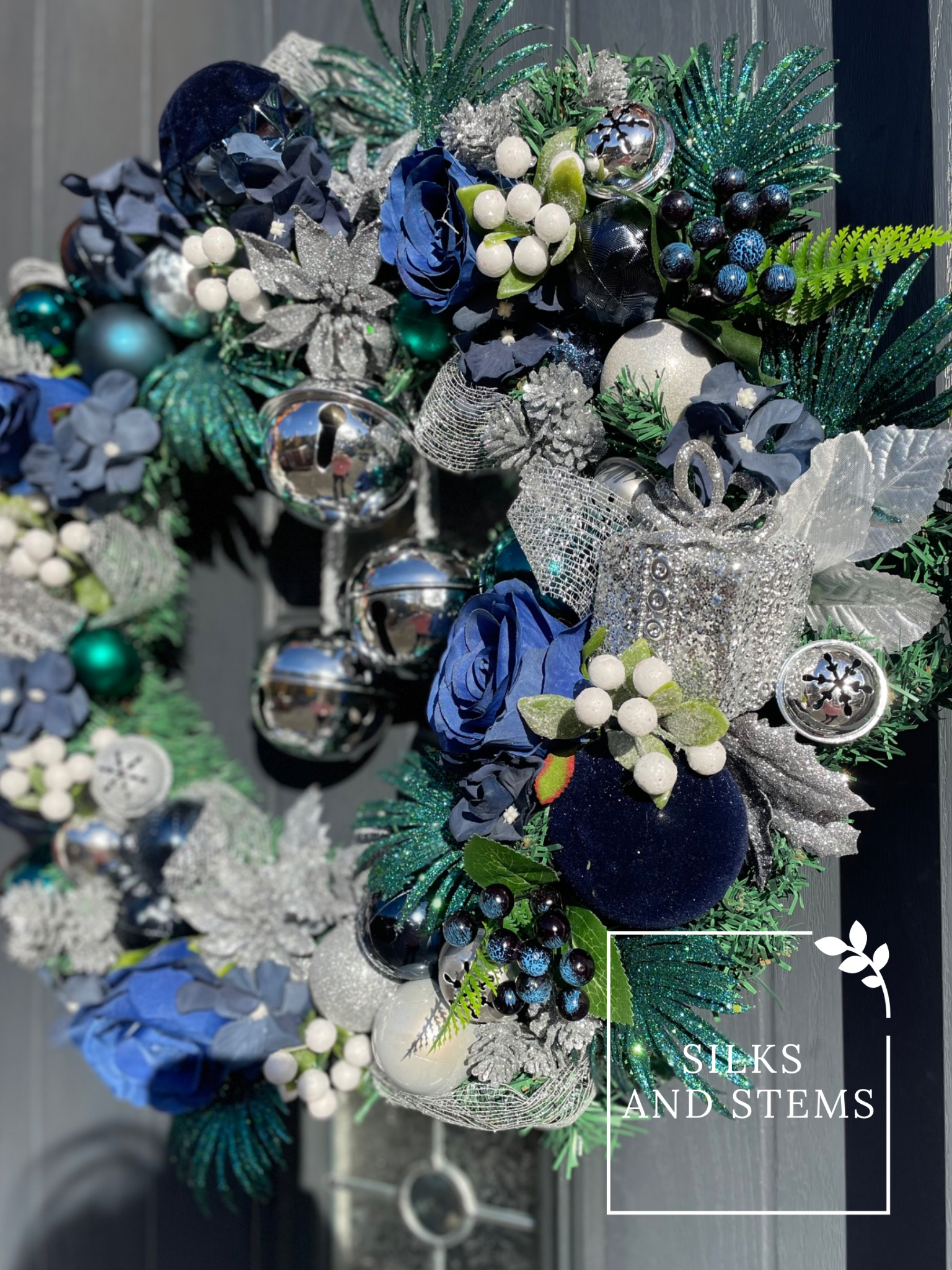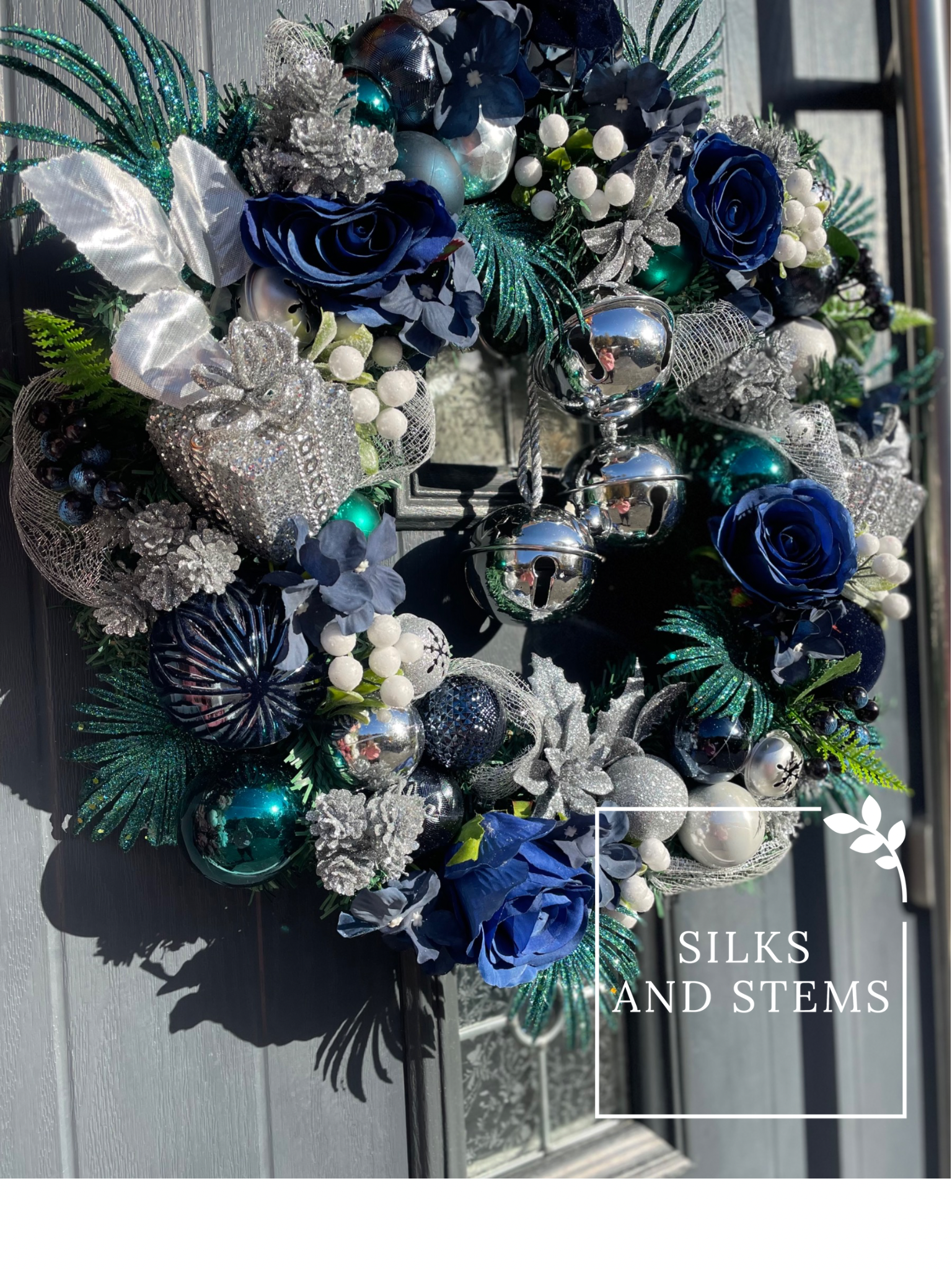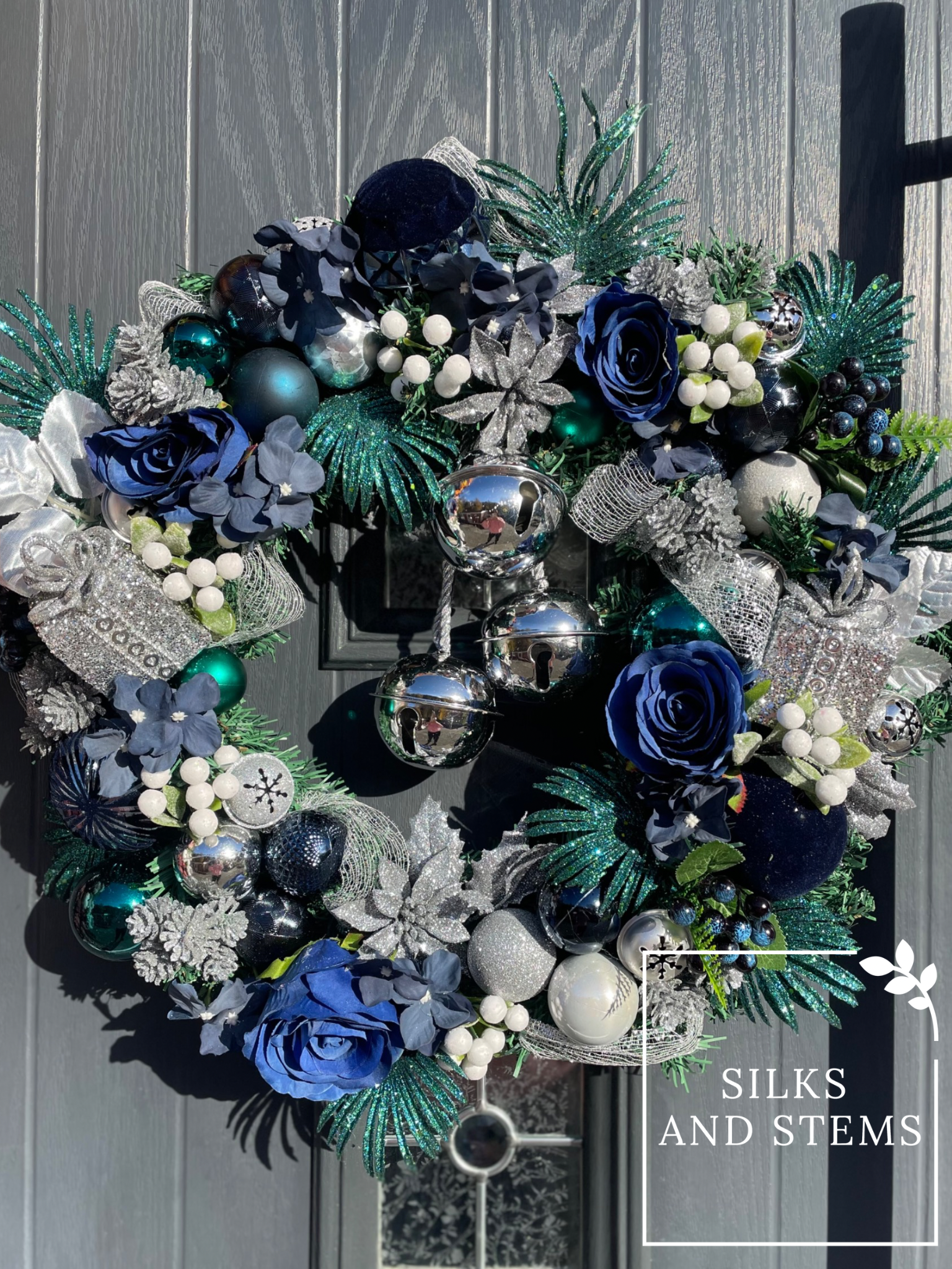Full of all the fun of the festive season including baubles, poinsettias, berries, with the twist of blue roses, navy hydrangeas and aqua glittery feathers surround the 3 large bells hanging in the centre.
